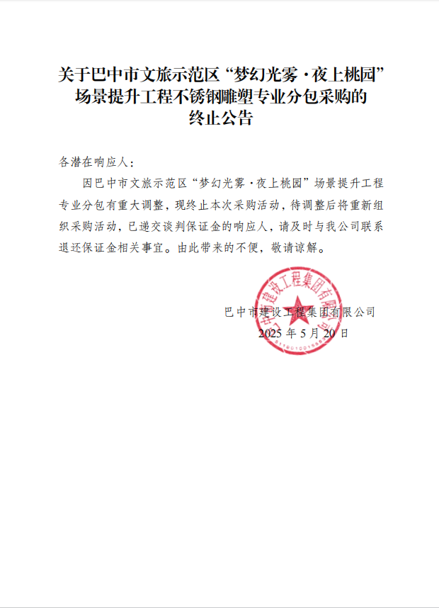 巴中市文旅示范区“梦幻光雾·夜上桃园”场景提升工程不锈钢雕塑专业分包采购的终止公告