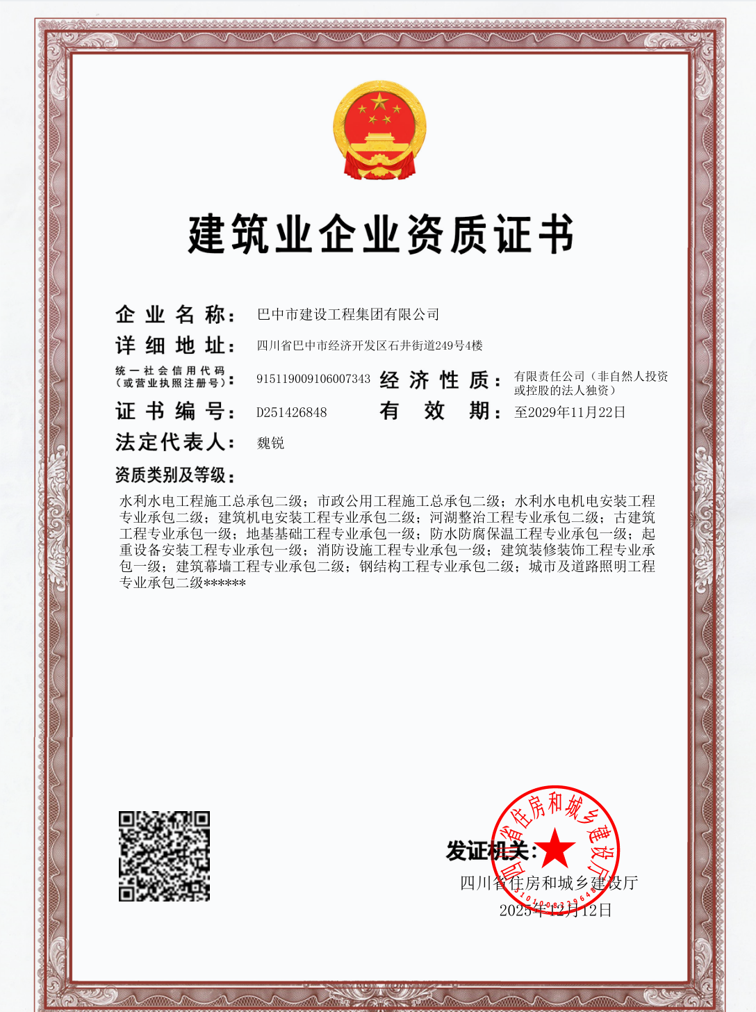 此次6项资质的集中获批,是行业主管部门对巴中建工集团在相关专业领域施工能力、技术水平、质量管理及项目业绩的权威认证,彰显了巴中建工集团深耕建筑行业的深厚积淀,为巴中建工集团更广泛、更深入地参与各类大型、复杂、高品质工程建设创造了有利条件,奠定了坚实基础。